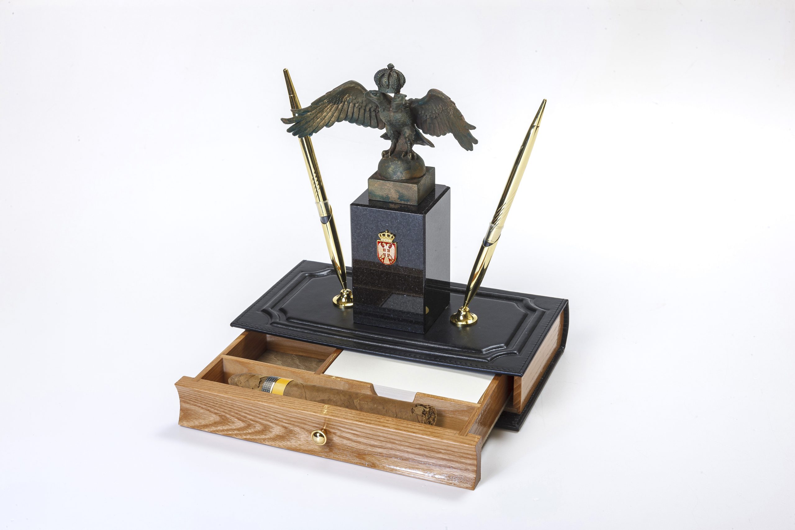 Orao na mermernom postolju sa setom olovaka i kutijom za odlaganje sitnog pribora.